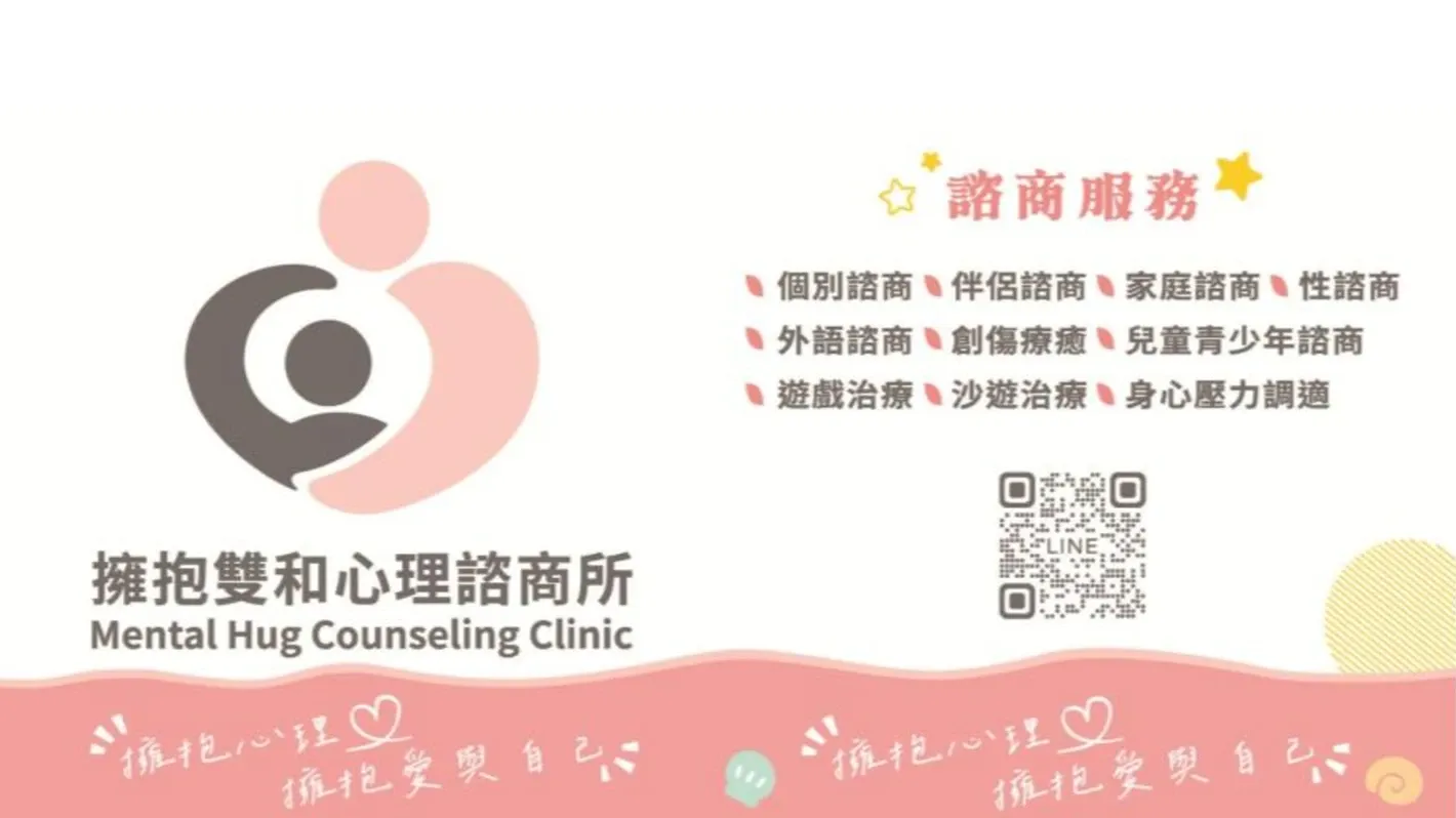 擁抱雙和心理諮商所 電話▐ 02-29222234 信箱▐ mentalhugs.shuangho@gmail.com 地址▐ 新北市永和區中和路343號12樓
