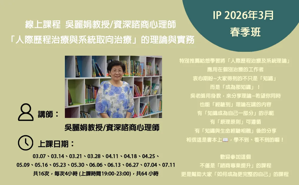 吳麗娟博士╱資深諮商心理師、師大心輔系兼任教授 麗娟老師從1994年回台後,便致力於人際歷程治療的推廣,2000年開始加入系統取向家族治療的內容繼續推廣IP,多年來在馬來西亞、澳門、大陸、台灣進行許多的演講、工作坊與教學。麗娟老師是美國Oregon大學諮商心理學博士(1994)、師大輔導研究所碩士(1985)、師大教心系學士(1980)。擁有台灣諮商心理師證照(2004)、台灣輔導及諮商學會認證督導。曾任台北市明德國中專任輔導教師三年(1980-1982),台師大心輔系專任教授、副教授、講師、助教,美國Oregon大學DeBusk中心治療師、督導,美國Oregon大學學生諮商中心治療師、督導,華心系統取向治療講座講師(2010-2017),北市專輔督導(2011-2021),華人心理治療研究發展基金會諮商心理師(2010-2025)。 曾獲得師鐸獎與傑出教學優良獎。目前仍是台北市陽明山教師研習中心諮詢顧問(1994-迄今),各公私立大專院校、各級學校兼任督導、講座(1994-迄今),各級法院、行政院、輔導各機構講座(1994-迄今),師大心輔系兼任教授(2014-迄今)。